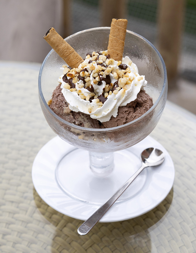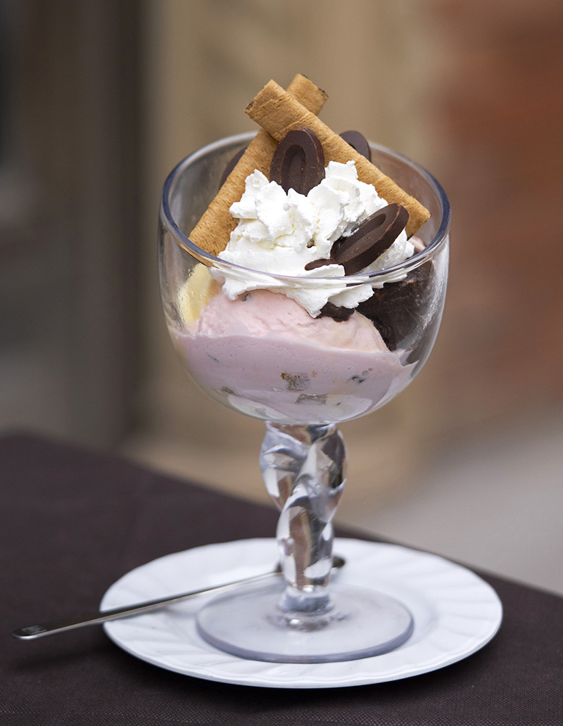 Gelato di ricotta, Canditi, Pistacchi, Cioccolato fondente in salsa