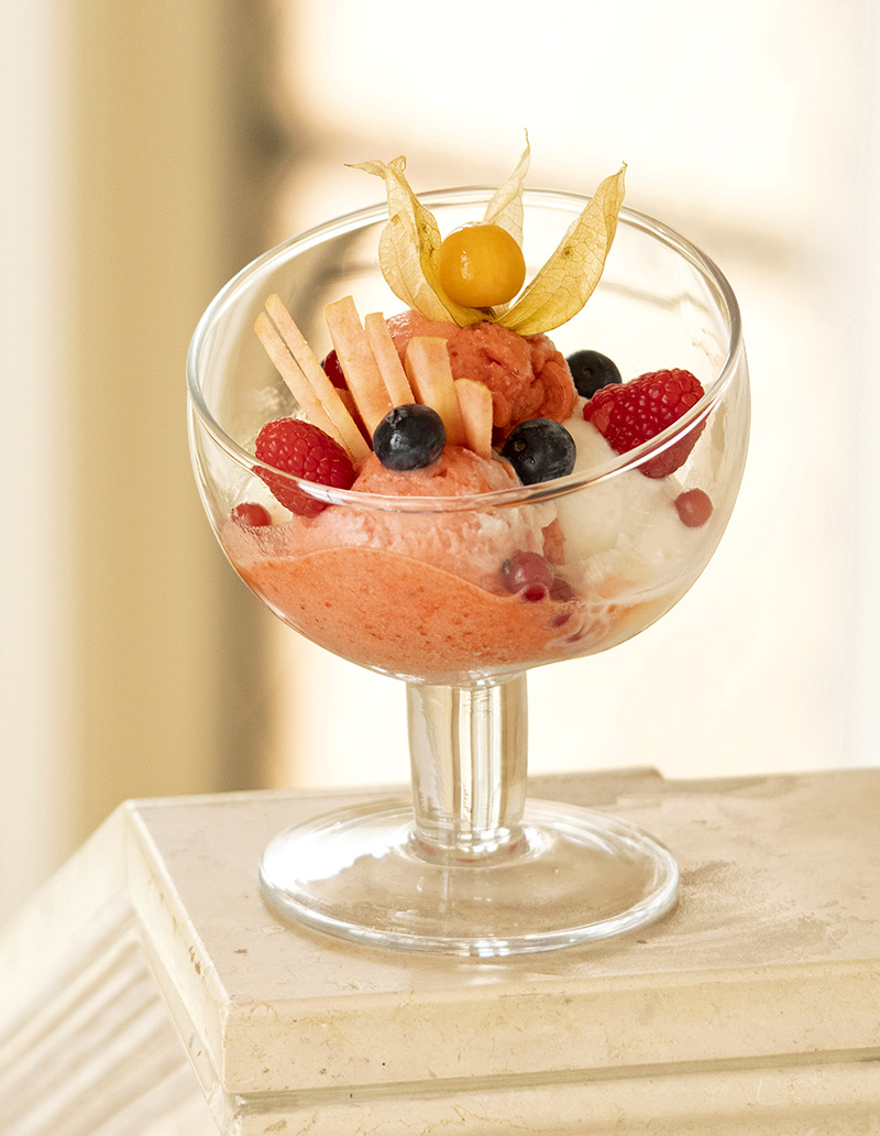 Gelato fior di latte, Pistacchio, Fragola, Macedonia di frutta, Panna, Decorata con frutta intagliata