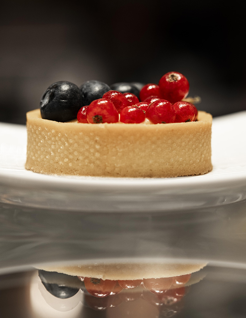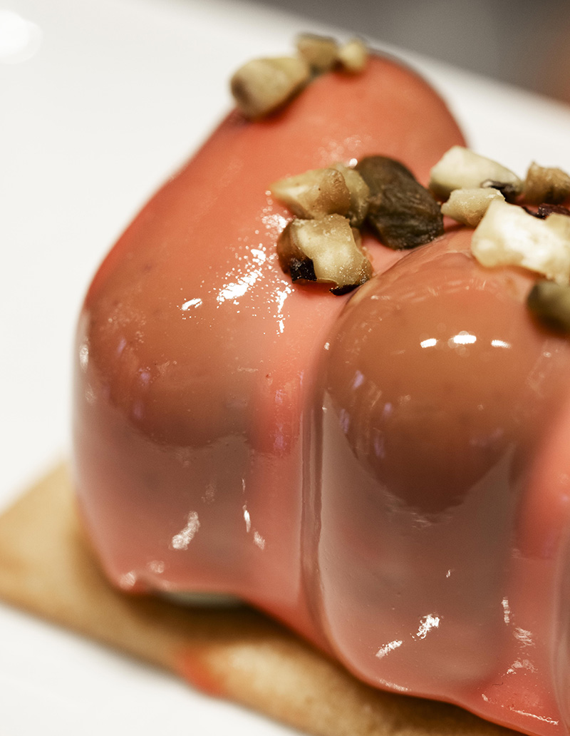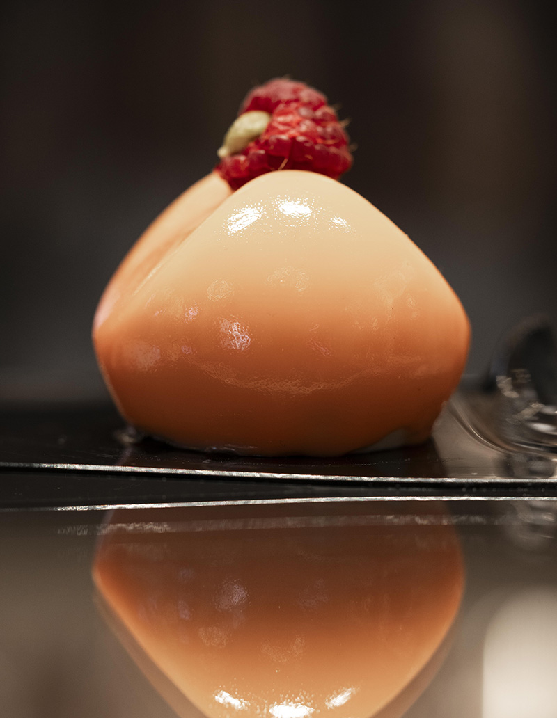 Mousse al bergamotto, Mousse al pistacchio, Gelée di lamponi, Biscuit di mandorle, Glassa al mandarino