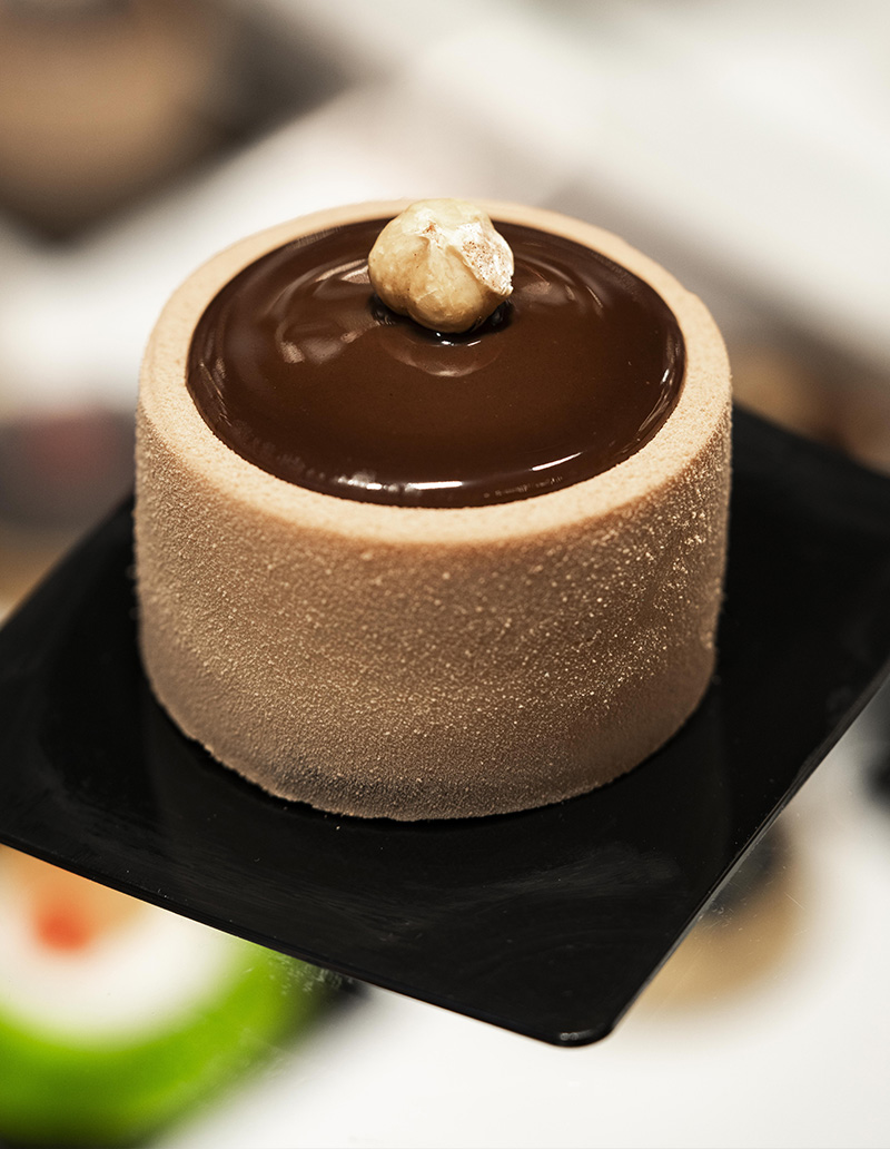 Glassa al cioccolato fondente, Cremoso alla vaniglia, Namelaka alle nocciole, Cuore di pralinato alle nocciole, Crumble alle nocciole